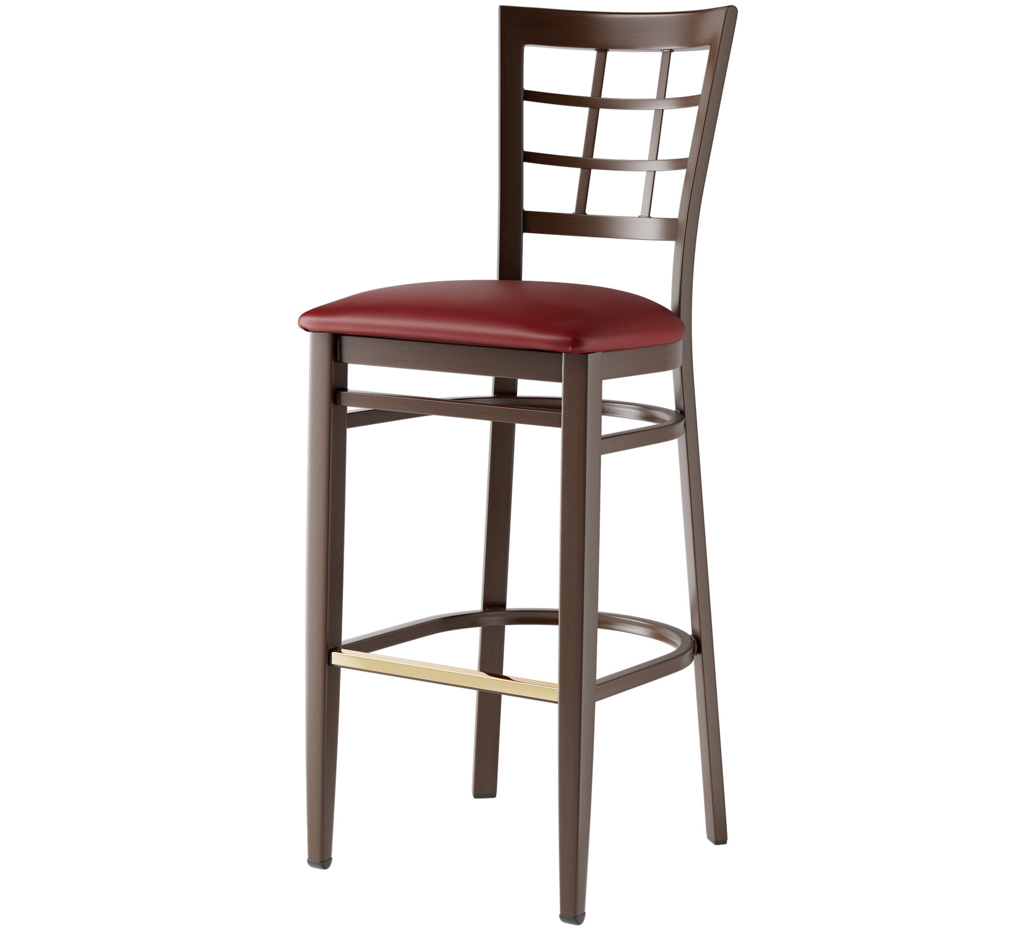Seat your guests in comfort and style with this Lancaster Table & Seating Spartan metal window back bar stool with dark walnut wood grain finish and 2 1/2" burgundy vinyl padded seat.