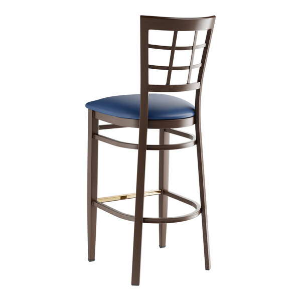 Seat your guests in comfort and style with this Lancaster Table & Seating Spartan metal window back bar stool with dark walnut wood grain finish and 2 1/2" navy vinyl padded seat.
