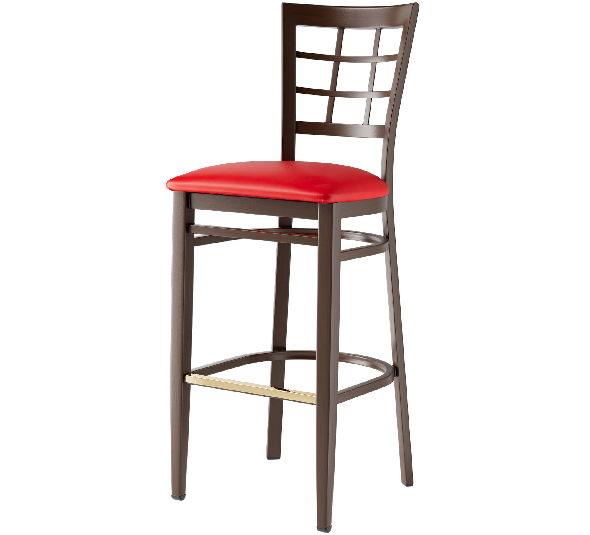 Seat your guests in comfort and style with this Lancaster Table & Seating Spartan metal window back bar stool with dark walnut wood grain finish and 2 1/2" red vinyl padded seat.