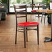 Seat your guests in comfort and style with this Lancaster Table & Seating Spartan metal ladder back chair with dark walnut wood grain finish and 2 1/2" red vinyl padded seat.