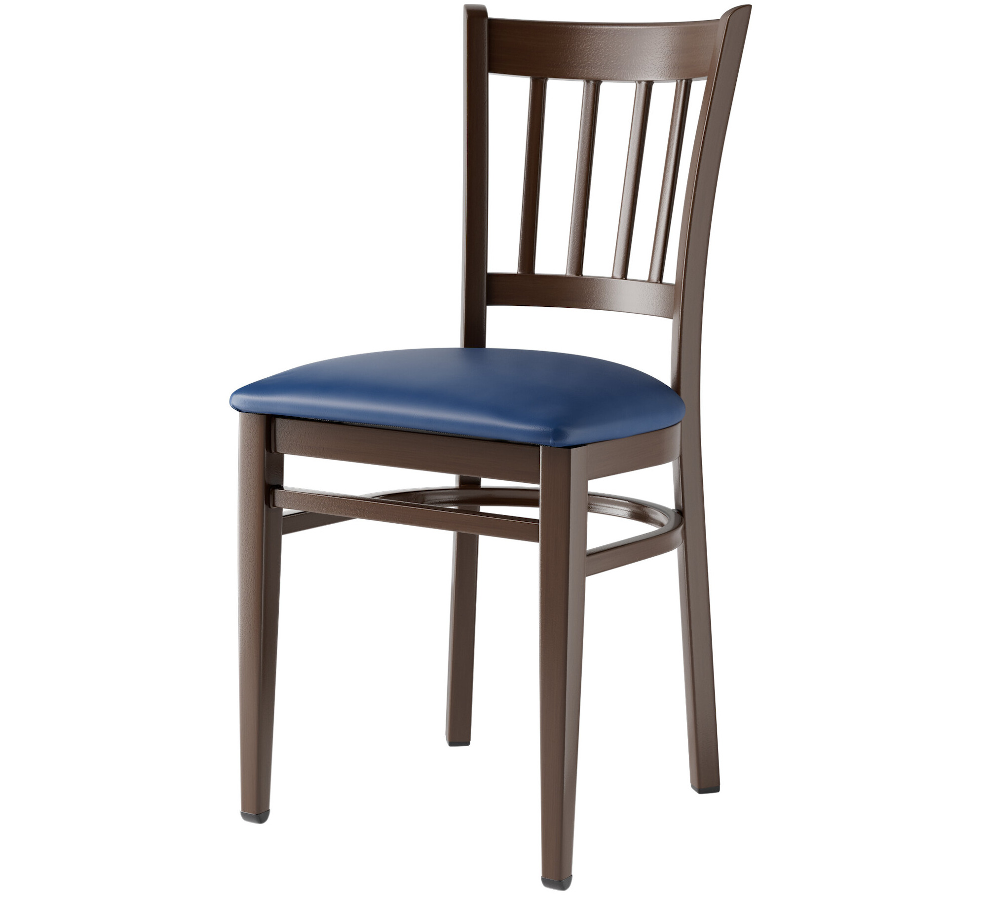 Seat your guests in comfort and style with this Lancaster Table & Seating Spartan metal slat back chair with dark walnut wood grain finish and 2 1/2" navy vinyl padded seat.