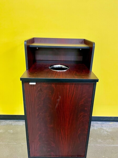 This waste bin is made out of very durable material and has a nice black finish to it. It looks perfect with the color scheme of my store. It actually looks a lot nicer than the ones you see at most fast food establishments. The shelf for trays are perfect so customers can dispose of their garbage and leave the tray right above.