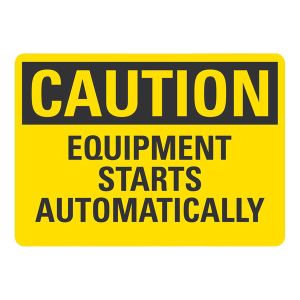 Ensure safety in your establishment with this Lavex safety label. It clearly communicates the need for caution around equipment that starts automatically, helping to prevent accidents and injuries in your workplace. It features a bold black banner with the word "Caution" displayed in bright yellow lettering followed by "Equipment Starts Automatically" in bold black lettering against a bright yellow background, making it easily visible from a distance and ensuring that employees and visitors are aware of the potential danger of sudden equipment activation. By prominently displaying this label, you promote a culture of safety and awareness in your workplace. Its 10" x 7" size is perfect for being seen without becoming an obstruction, and the glossy finish not only adds a professional touch but also makes it easy to keep clean, maintaining visibility and readability at all times.