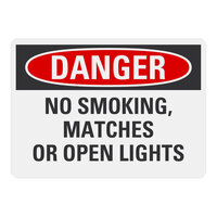 Clearly prohibit smoking in designated areas with this Lavex safety sign. Built for enhanced visibility, this item warns against smoking, matches, or open lights in hazardous areas where the risk of fire, spark, or explosion is present. While its vibrant red, white, and black color contrast helps to draw attention, its bold "Danger / No Smoking, Matches Or Open Lights" text allows for easy readability and comprehension. Plus, it features rounded corners for added safety and a sleek, professional look. It also has a maximum external temperature of 180 degrees Fahrenheit.