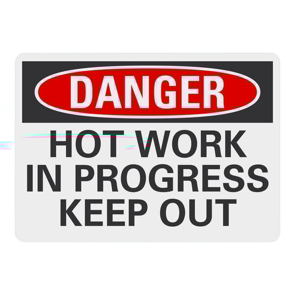 Enhance workplace safety with this Lavex safety sign. It's designed to clearly restrict entrance into designated areas where hot work is taking place. It features a bold black and red banner with the word "Danger" encircled and displayed in bright white lettering followed by "Hot Work In Progress / Keep Out" in bold black lettering against a bright white background, making it easily visible from a distance. Restricting access to areas with active hot work helps prevent accidents and injuries, making it an essential addition to any industrial setting. Its 14" x 10" size is perfect for being seen without becoming an obstruction, and the rounded corners not only enhance its professional look but also ensure safety by eliminating sharp edges.