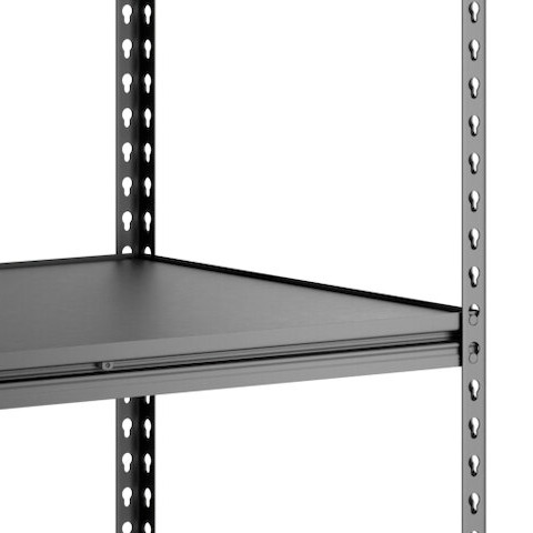 Each shelf has an impressive 800 lb. load capacity, so you can confidently store heavy or oversized items. Since the shelves are solid, they allow for efficient loading and unloading and can easily accommodate items that might fall through regular vented or wire shelving. Plus, the black laminate shelves are not only easy to wipe down and clean, but they also provide a sleek, professional look.