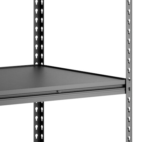 Each shelf has an impressive 800 lb. load capacity, so you can confidently store heavy or oversized items. Since the shelves are solid, they allow for efficient loading and unloading and can easily accommodate items that might fall through regular vented or wire shelving. Plus, the black laminate shelves are not only easy to wipe down and clean, but they also provide a sleek, professional look.