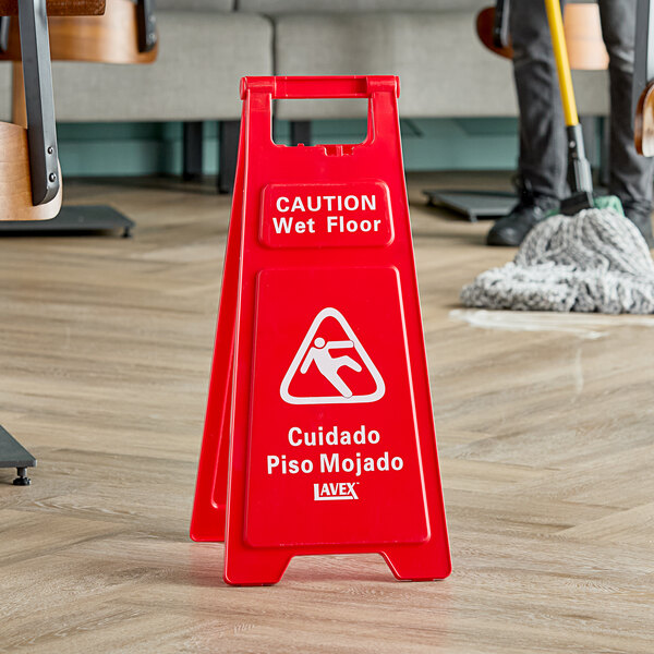 This safety sign features a red polypropylene construction, is light weight, and is designed for maximum visibility. Its A-frame style offers a quick, easy setup wherever floors are wet, and it collapses for out-of-the-way storage when not in use.