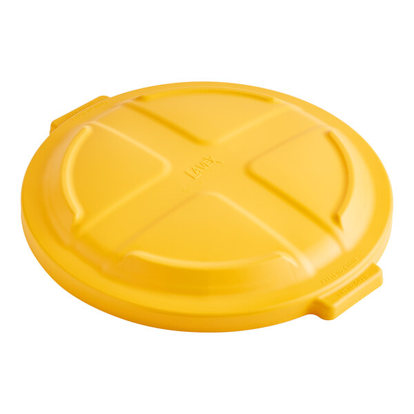 This Lavex 32 gallon yellow trash can lid is essential for minimizing odors and keeping debris from falling into your commercial trash can. With a pair of integrated handles, this lid makes it easier than ever to close and lock the lid onto its can. It boasts a tight fit to ensure the can's contents won't fall out or come into contact with airborne contaminants, providing your facility with safe disposal and transport from one destination to the next. This durable trash container lid also features an all-plastic, heavy-duty construction in order to resist dents, rust, or peeling with continuous use. Use this lid with your compatible Lavex 32 gallon trash can (sold separately).