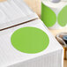 This label is easy to write on thanks to its blank design. Made with a 1 1/2" core diameter and pressure-sensitive paper with permanent adhesive, this item can be confidently placed on trays, plastic containers, boxes, and folders. The label's 4" diameter is the perfect size to mark inventory or create charts and visual aids.