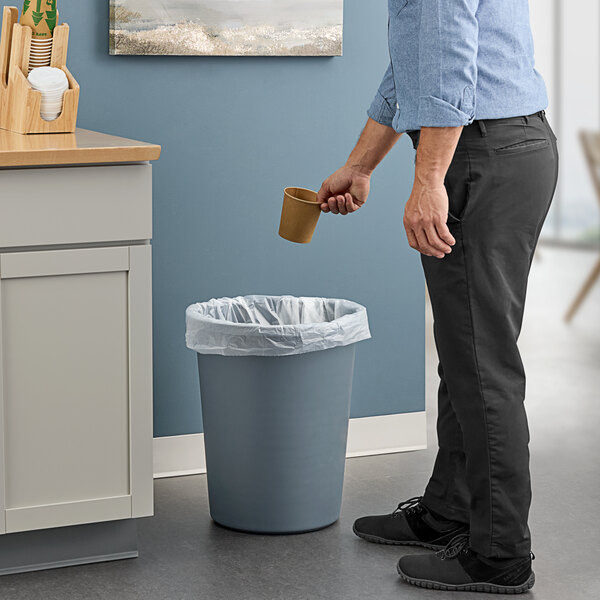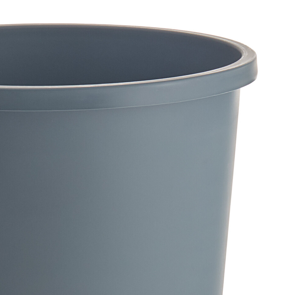 This convenient wastebasket is made from high-density polyethylene, ensuring long-lasting use. The durable construction is resistant to fading, denting, and rusting, making it a reliable addition to your establishment. It also boasts a gray color that blends in seamlessly in offices or commercial settings.