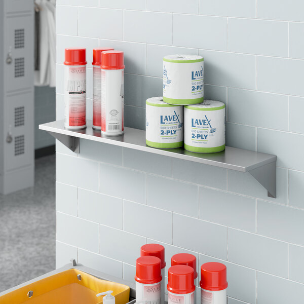 Create additional storage space using this Lavex 6" wide stainless steel wall-mount shelf.