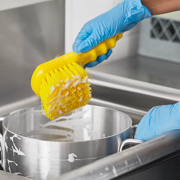 For your convenience, this brush's yellow color allows for quick identification in color-coded operations. This helps to reduce the risk of cross-contamination. Use this brush to clean pots and pans, scrub floors, or clean tables.