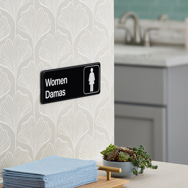 The stark black and white contrast of the sign guarantees optimal visibility, making it easy to spot from a distance. Ideal for restaurants, cafes, and other businesses, this versatile sign helps maintain a professional and organized atmosphere, elevating the overall experience for your guests. Upgrade your restroom signage with the Lavex women's / damas restroom sign for clear and effective communication in multiple languages.