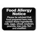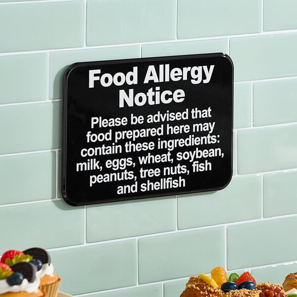 Keep your guests informed with this Lavex 9" x 6" black and white "Food Allergy Notice" sign. Made from durable plastic, this sign clearly alerts patrons that foods prepared in your establishment may contain common allergens like milk, eggs, wheat, soy, peanuts, tree nuts, fish, and shellfish. The printed lettering helps ensure the message is easy to read for those with food sensitivities.
