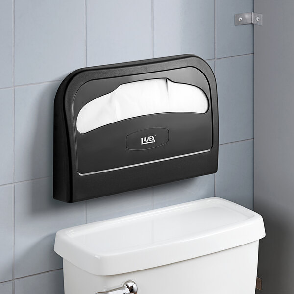 Whether in a bustling restaurant, busy office building, or crowded event venue, this toilet seat cover dispenser is a must-have for maintaining hygiene and comfort in your commercial restroom facilities. Upgrade your restroom experience with this durable Lavex black toilet seat cover dispenser today!