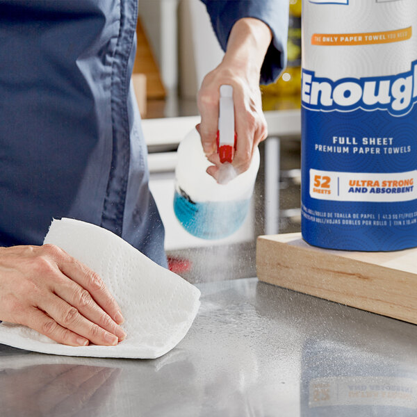This 52 sheet paper towel roll is ultra strong yet soft and absorbent, requiring fewer sheets for cleanup and minimizing waste. This paper towel is perfect for stocking your pantry, break room, or kitchen.
