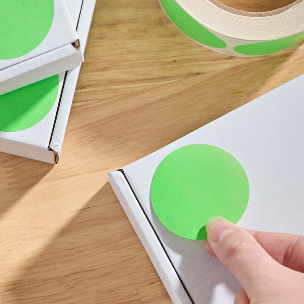 This roll of round labels makes it easy to create a color-coded system to help simplify inventory tasks and procedures. Thanks to the green background, you can create a process that all of your employees can follow. Ideal for grocery stores, restaurants, and delis, this versatile label roll is a simple way to add structure and efficiency to daily tasks. This label roll includes 500 labels.