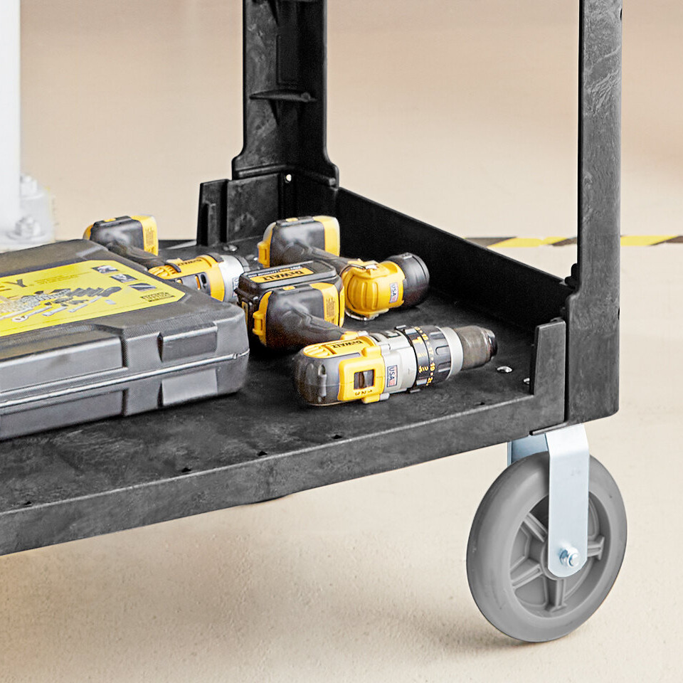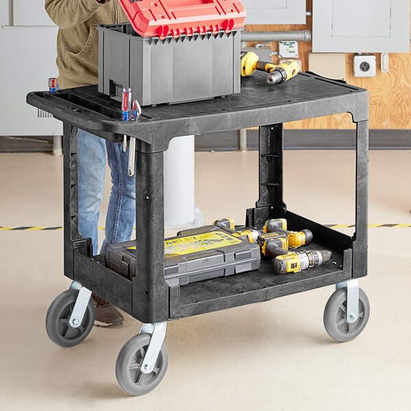 Lavex Large Black 2-Shelf Utility Cart with Flat Top, Built-In Tool Compartment, and Oversized Wheels