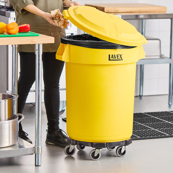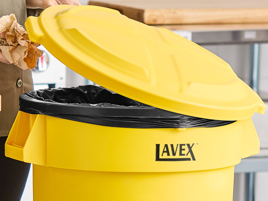 This Lavex trash can is essential for a variety of tasks, including proper trash storage and removal. The yellow coloring helps this trash can stand out, and it's great for creating a color-coded system in your kitchen to prevent cross-contamination. Regardless of whether you need a recycling can, trash can, or large bulk storage container, this can is sure to do the job! This can boasts NSF standard 21, meaning it meets the minimum sanitation requirements for materials, design, and construction of new thermoplastic refuse containers intended for indoor and outdoor refuse storage.