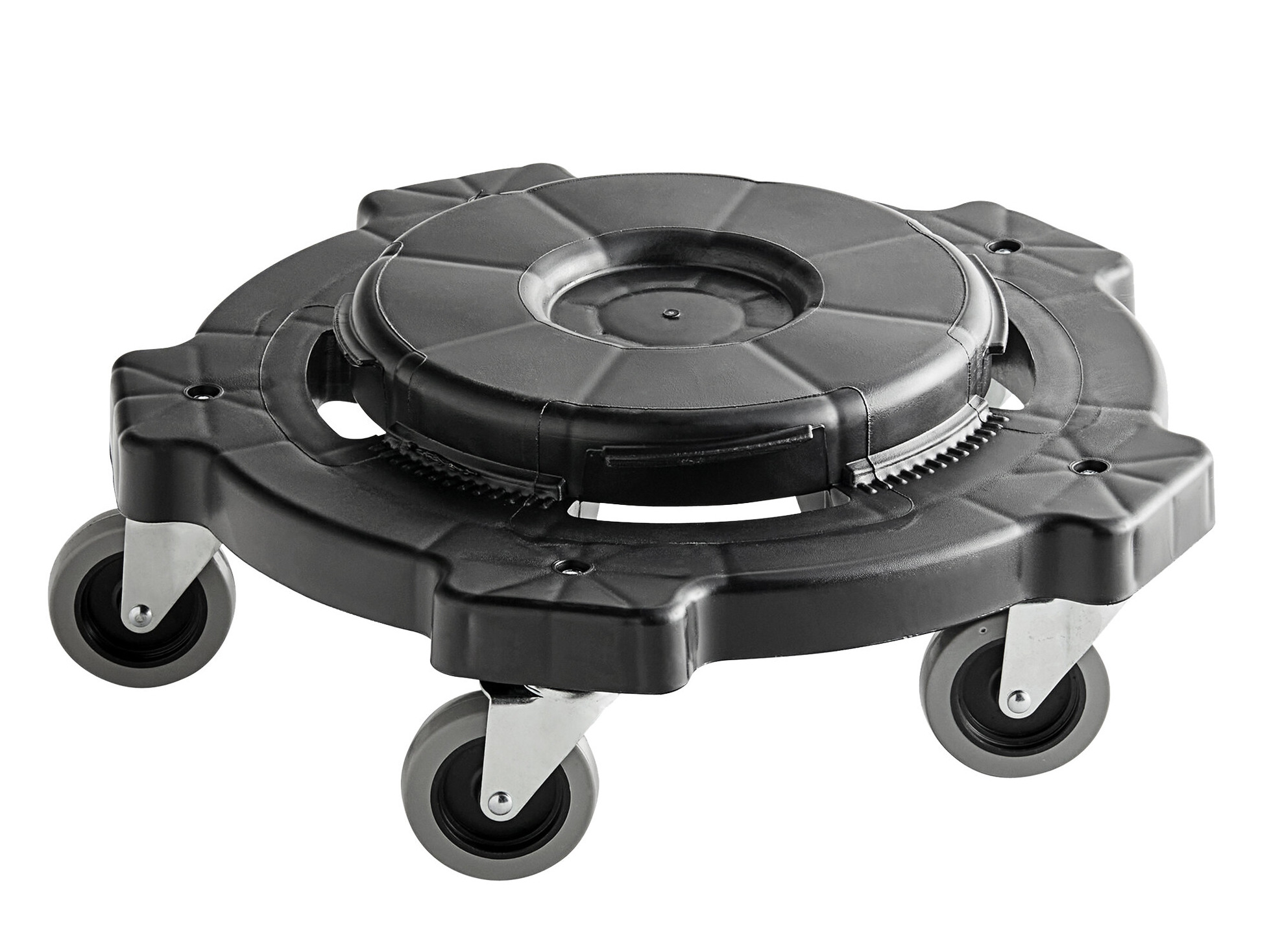 This trash can with dolly is a great value! We purchased two of these for our restaurant and they have held up very well. The dolly is really nice and locks into the trash can so it doesn't come undone. There are 5 wheels and they roll really nice. The thickness of the trash can is nice and heavy duty. We are very pleased with these trash cans!