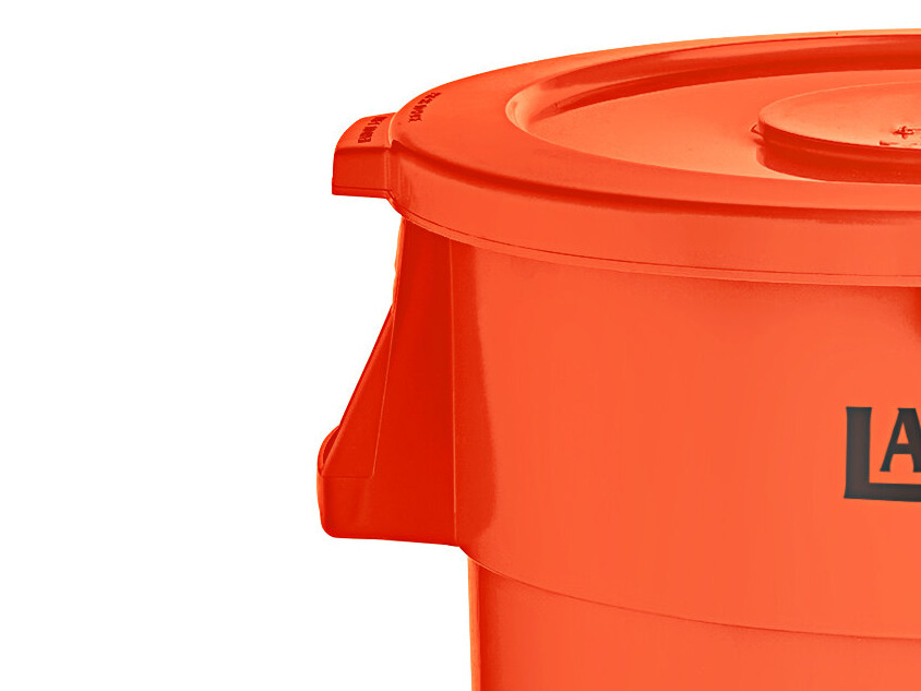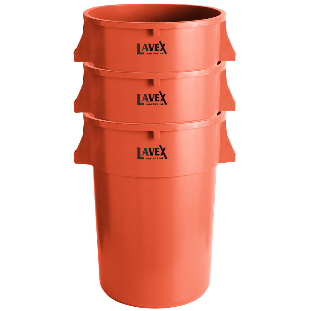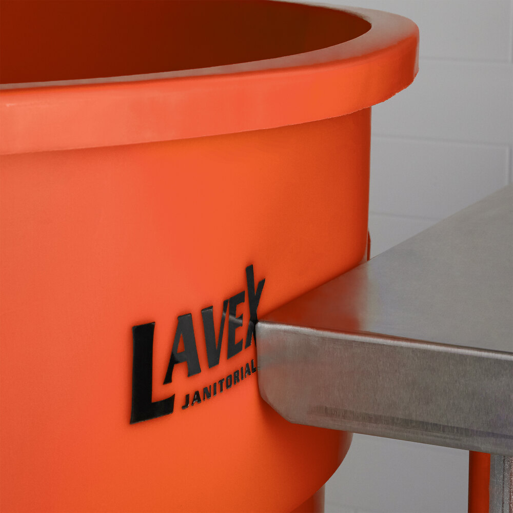 This Lavex orange trash can is essential for a variety of tasks, including proper trash storage and removal. The orange coloring helps this trash can stand out and it's great for creating a color-coded system in your kitchen to prevent cross-contamination. Regardless of whether you need a recycling can, trash can, or large bulk storage container, this can is sure to do the job! This can boasts NSF standard 21, meaning it meets the minimum sanitation requirements for materials, design, and construction of new thermoplastic refuse containers intended for indoor and outdoor refuse storage. The twist-on dolly style has a 250 lb. weight limit and is simple to use. It also extends the overall life of the can by not dragging it on the ground.