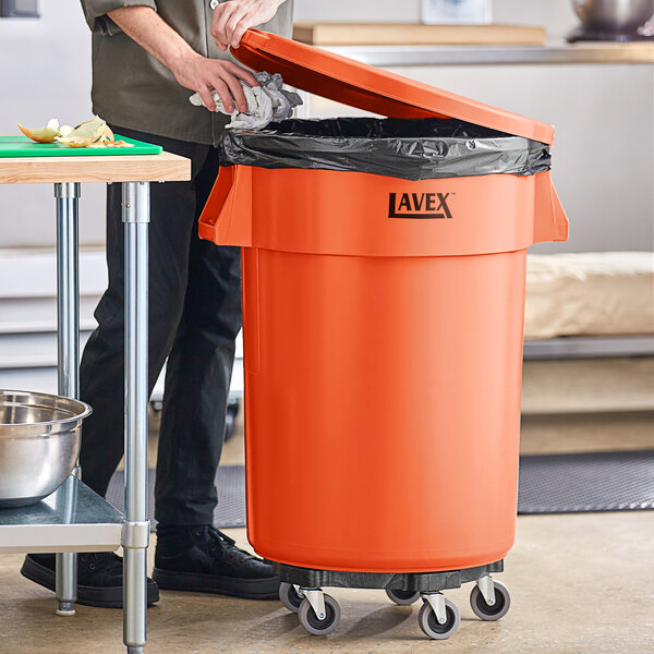 The lavex janitorial 32 gallon orange round commercial trash can with lid and dolly is the full package. Every restaurant would benefit from having this product.