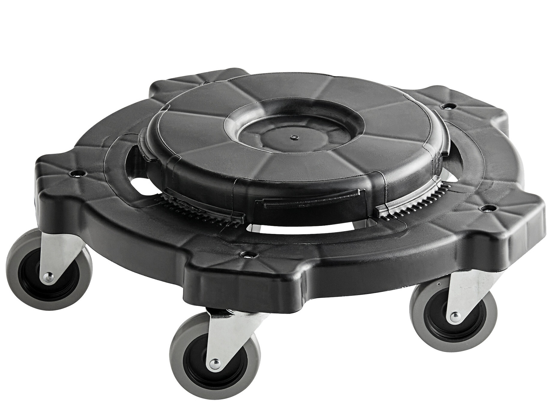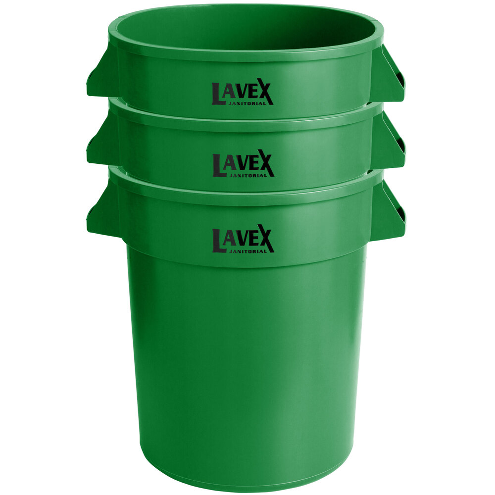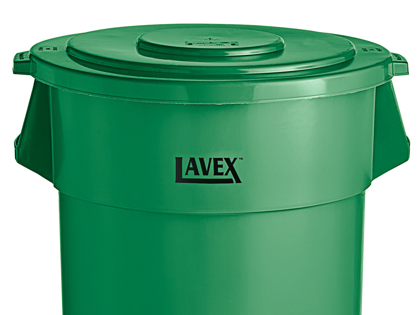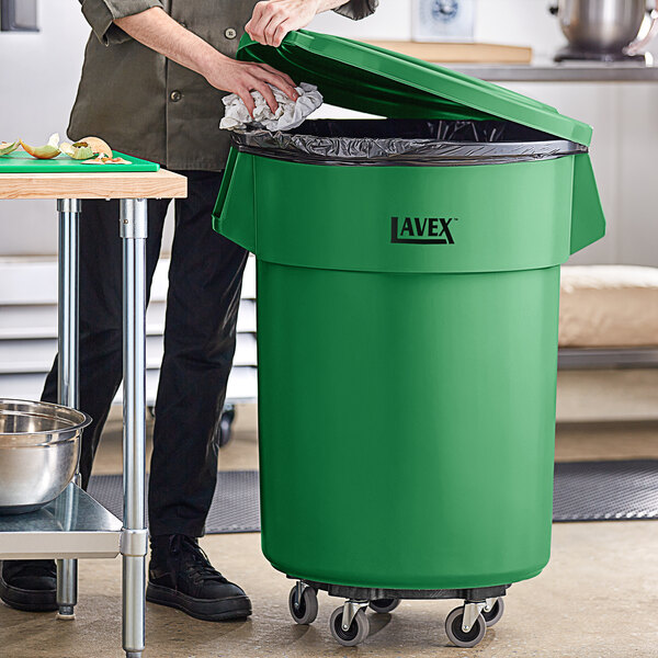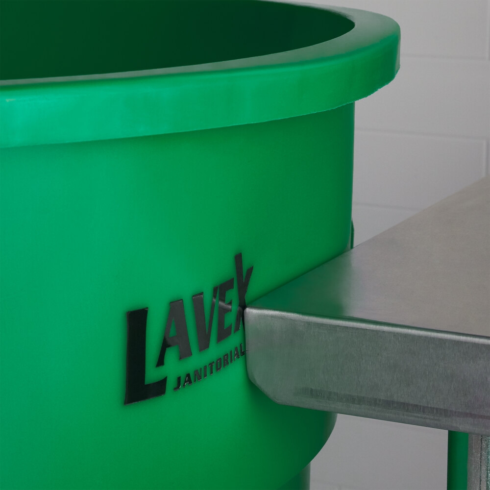 This Lavex green trash can is essential for a variety of tasks, including proper trash storage and removal. The green coloring helps this trash can stand out and it's great for creating a color-coded system in your kitchen to prevent cross-contamination. Regardless of whether you need a recycling can, trash can, or large bulk storage container, this can is sure to do the job! This can boasts NSF standard 2, meaning it meets the minimum food protection and sanitation requirements for materials, design, fabrication, construction, and performance of food handling and processing equipment in bakeries, cafeterias, kitchens, and pantry units. The twist-on dolly style has a 250 lb. weight limit and is simple to use. It also extends the overall life of the can by not dragging it on the ground.