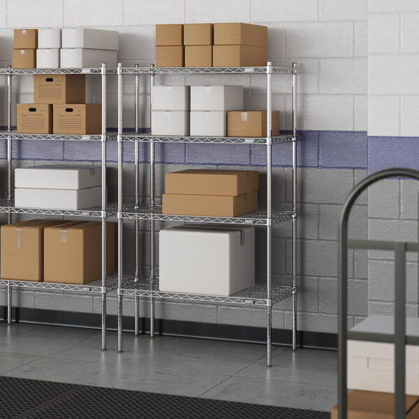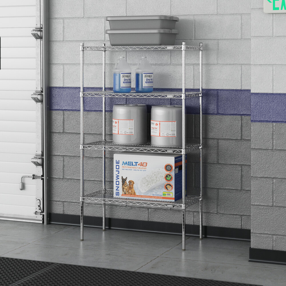 Designed for use in dry environments, this shelving unit is an excellent choice for organizing and maximizing storage space. Whether you're looking to streamline your warehouse operations or simply need additional storage in your industrial facility, this heavy-duty shelving kit is the perfect solution. Mix and match with Lavex Pro accessories (sold separately) to personalize your kit! Invest in the Lavex Pro chrome heavy-duty 4-shelf kit and experience the durability and functionality it brings to your workspace.