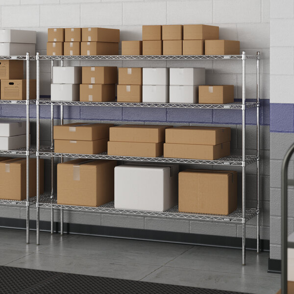 Designed for use in dry environments, this shelving unit is an excellent choice for organizing and maximizing storage space. Whether you're looking to streamline your warehouse operations or simply need additional storage in your industrial facility, this heavy-duty shelving kit is the perfect solution. Mix and match with Lavex Pro accessories (sold separately) to personalize your kit! Invest in the Lavex Pro chrome heavy-duty 4-shelf kit and experience the durability and functionality it brings to your workspace.