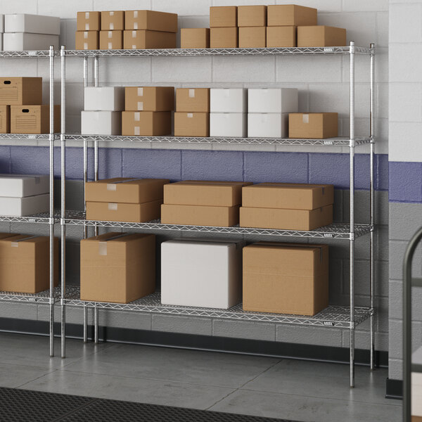 Designed for use in dry environments, this shelving unit is an excellent choice for organizing and maximizing storage space. Whether you're looking to streamline your warehouse operations or simply need additional storage in your industrial facility, this heavy-duty shelving kit is the perfect solution. Mix and match with Lavex Pro accessories (sold separately) to personalize your kit! Invest in the Lavex Pro chrome heavy-duty 4-shelf kit and experience the durability and functionality it brings to your workspace.