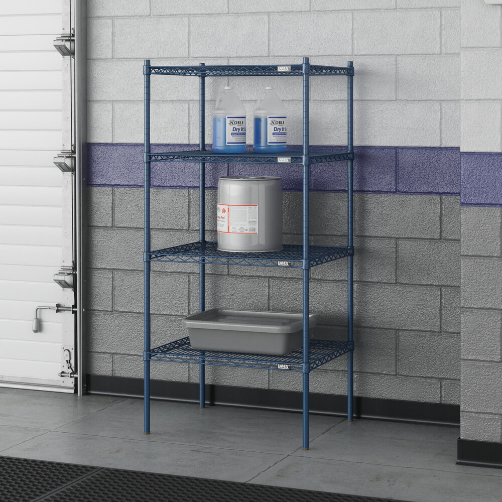 Designed for use in moist or damp environments, this shelving unit is an excellent choice for organizing and maximizing storage space. Whether you're looking to streamline your warehouse operations or simply need additional storage in your industrial facility, this heavy-duty shelving kit is the perfect solution. Mix and match with Lavex Pro accessories (sold separately) to personalize your kit! Invest in the Lavex Pro blue epoxy heavy-duty 4-shelf kit and experience the durability and functionality it brings to your workspace.