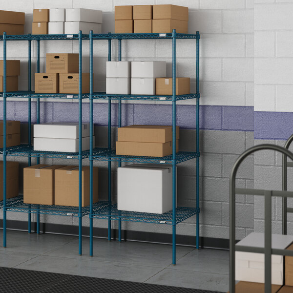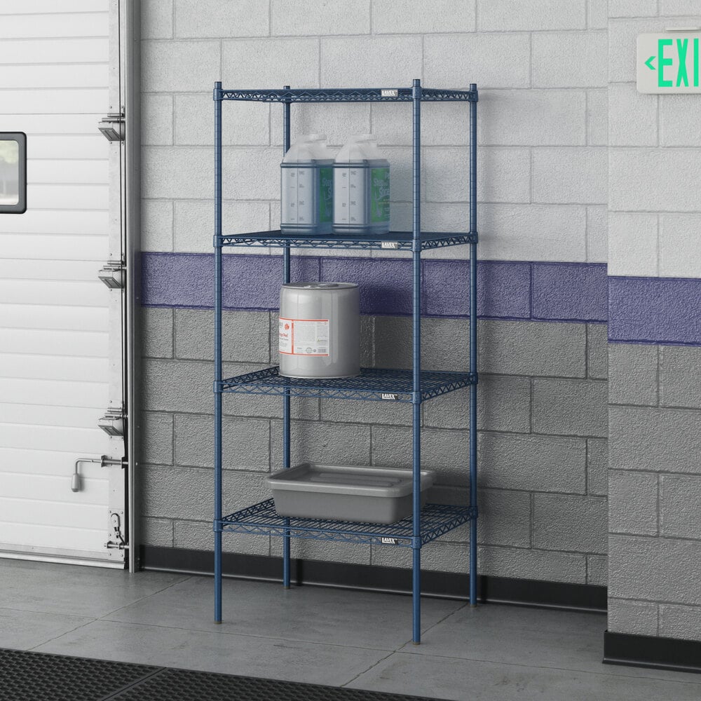Designed for use in moist or damp environments, this shelving unit is an excellent choice for organizing and maximizing storage space. Whether you're looking to streamline your warehouse operations or simply need additional storage in your industrial facility, this heavy-duty shelving kit is the perfect solution. Mix and match with Lavex Pro accessories (sold separately) to personalize your kit! Invest in the Lavex Pro blue epoxy heavy-duty 4-shelf kit and experience the durability and functionality it brings to your workspace.