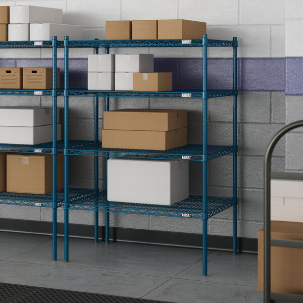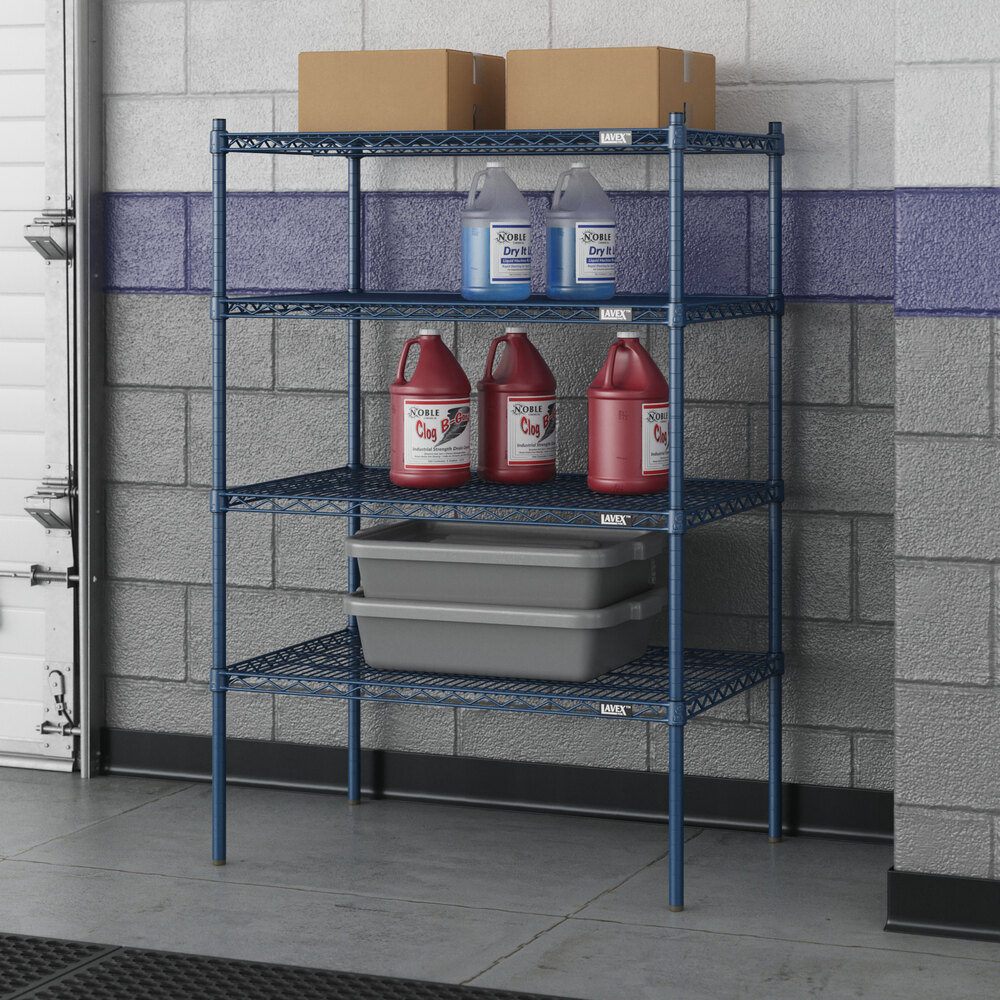 Designed for use in moist or damp environments, this shelving unit is an excellent choice for organizing and maximizing storage space. Whether you're looking to streamline your warehouse operations or simply need additional storage in your industrial facility, this heavy-duty shelving kit is the perfect solution. Mix and match with Lavex Pro accessories (sold separately) to personalize your kit! Invest in the Lavex Pro blue epoxy heavy-duty 4-shelf kit and experience the durability and functionality it brings to your workspace.