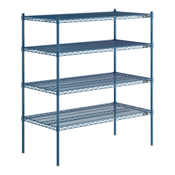 Designed for use in moist or damp environments, this shelving unit is an excellent choice for organizing and maximizing storage space. Whether you're looking to streamline your warehouse operations or simply need additional storage in your industrial facility, this heavy-duty shelving kit is the perfect solution. Mix and match with Lavex Pro accessories (sold separately) to personalize your kit! Invest in the Lavex Pro blue epoxy heavy-duty 4-shelf kit and experience the durability and functionality it brings to your workspace.