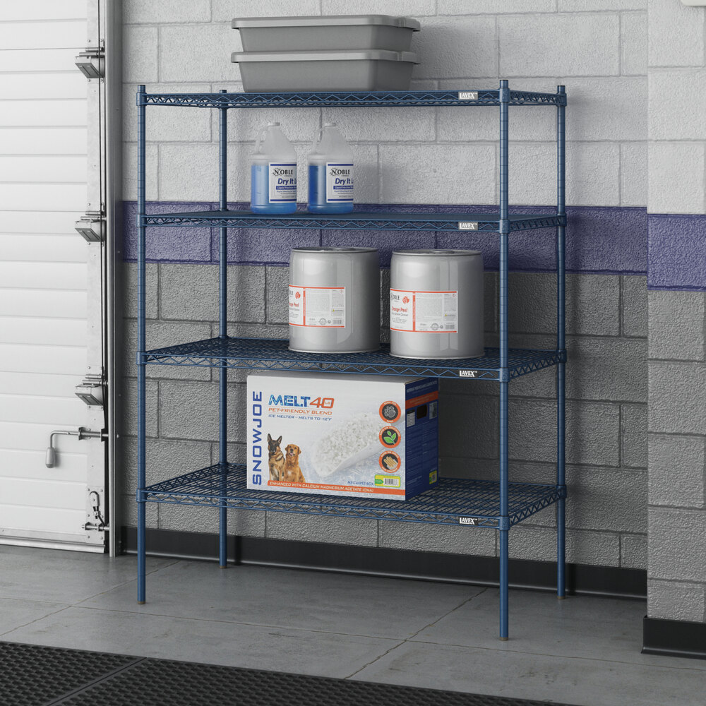 Designed for use in moist or damp environments, this shelving unit is an excellent choice for organizing and maximizing storage space. Whether you're looking to streamline your warehouse operations or simply need additional storage in your industrial facility, this heavy-duty shelving kit is the perfect solution. Mix and match with Lavex Pro accessories (sold separately) to personalize your kit! Invest in the Lavex Pro blue epoxy heavy-duty 4-shelf kit and experience the durability and functionality it brings to your workspace.
