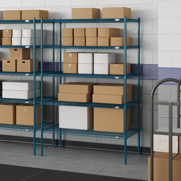Designed for use in moist or damp environments, this shelving unit is an excellent choice for organizing and maximizing storage space. Whether you're looking to streamline your warehouse operations or simply need additional storage in your industrial facility, this heavy-duty shelving kit is the perfect solution. Mix and match with Lavex Pro accessories (sold separately) to personalize your kit! Invest in the Lavex Pro blue epoxy heavy-duty 5-shelf kit and experience the durability and functionality it brings to your workspace.