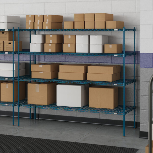 Designed for use in moist or damp environments, this shelving unit is an excellent choice for organizing and maximizing storage space. Whether you're looking to streamline your warehouse operations or simply need additional storage in your industrial facility, this heavy-duty shelving kit is the perfect solution. Mix and match with Lavex Pro accessories (sold separately) to personalize your kit! Invest in the Lavex Pro blue epoxy heavy-duty 4-shelf kit and experience the durability and functionality it brings to your workspace.