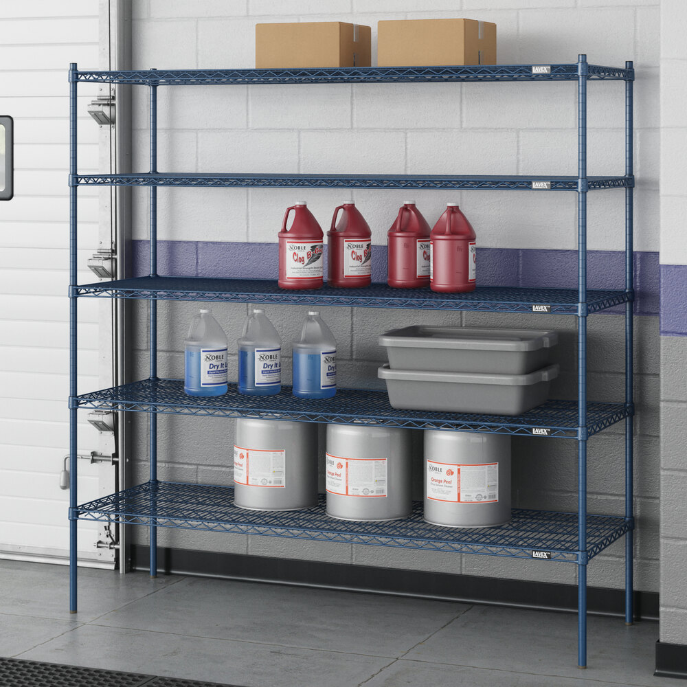 Designed for use in moist or damp environments, this shelving unit is an excellent choice for organizing and maximizing storage space. Whether you're looking to streamline your warehouse operations or simply need additional storage in your industrial facility, this heavy-duty shelving kit is the perfect solution. Mix and match with Lavex Pro accessories (sold separately) to personalize your kit! Invest in the Lavex Pro blue epoxy heavy-duty 5-shelf kit and experience the durability and functionality it brings to your workspace.