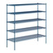 This kit includes (4) 74" posts, (5) 24" x 72" shelves, and 20 pairs of split sleeves. Made of durable, heavy-duty, reinforced, blue epoxy-coated steel, this unit is built to last. The epoxy coating is antimicrobial, protecting it from bacteria, mold, mildew, and fungi. It's also resistant to rust and corrosion, ensuring that it will maintain its quality even in demanding environments. This unit requires assembly.