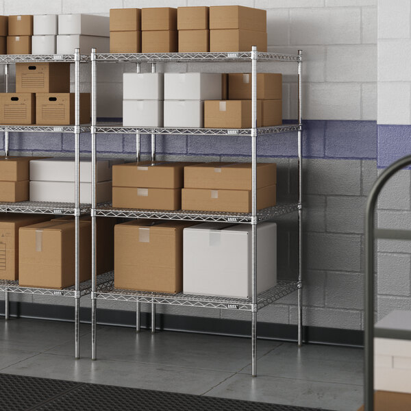 Designed for use in dry environments, this shelving unit is an excellent choice for organizing and maximizing storage space. Whether you're looking to streamline your warehouse operations or simply need additional storage in your industrial facility, this heavy-duty shelving kit is the perfect solution. Mix and match with Lavex Pro accessories (sold separately) to personalize your kit! Invest in the Lavex Pro chrome heavy-duty 4-shelf kit and experience the durability and functionality it brings to your workspace.