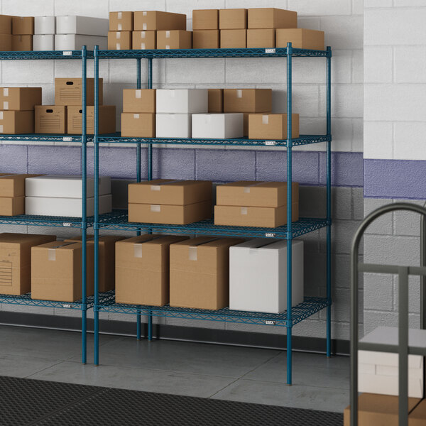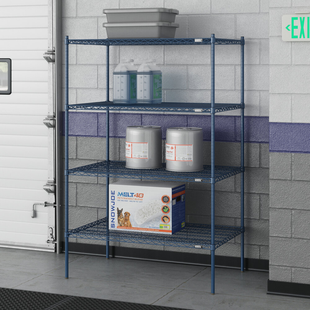 Designed for use in moist or damp environments, this shelving unit is an excellent choice for organizing and maximizing storage space. Whether you're looking to streamline your warehouse operations or simply need additional storage in your industrial facility, this heavy-duty shelving kit is the perfect solution. Mix and match with Lavex Pro accessories (sold separately) to personalize your kit! Invest in the Lavex Pro blue epoxy heavy-duty 4-shelf kit and experience the durability and functionality it brings to your workspace.