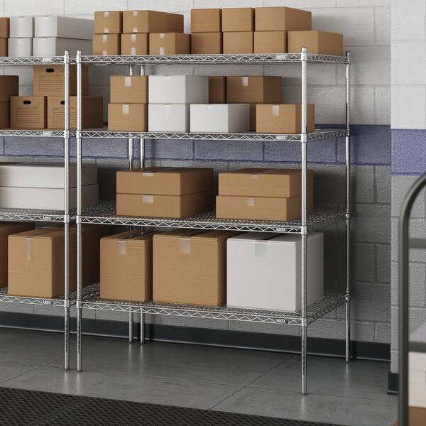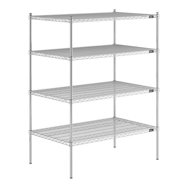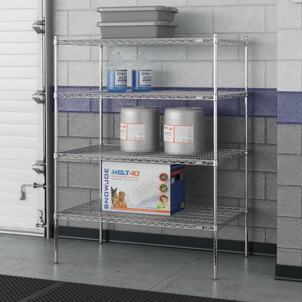 Designed for use in dry environments, this shelving unit is an excellent choice for organizing and maximizing storage space. Whether you're looking to streamline your warehouse operations or simply need additional storage in your industrial facility, this heavy-duty shelving kit is the perfect solution. Mix and match with Lavex Pro accessories (sold separately) to personalize your kit! Invest in the Lavex Pro chrome heavy-duty 4-shelf kit and experience the durability and functionality it brings to your workspace.