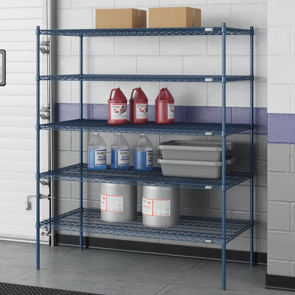 Designed for use in moist or damp environments, this shelving unit is an excellent choice for organizing and maximizing storage space. Whether you're looking to streamline your warehouse operations or simply need additional storage in your industrial facility, this heavy-duty shelving kit is the perfect solution. Mix and match with Lavex Pro accessories (sold separately) to personalize your kit! Invest in the Lavex Pro blue epoxy heavy-duty 5-shelf kit and experience the durability and functionality it brings to your workspace.