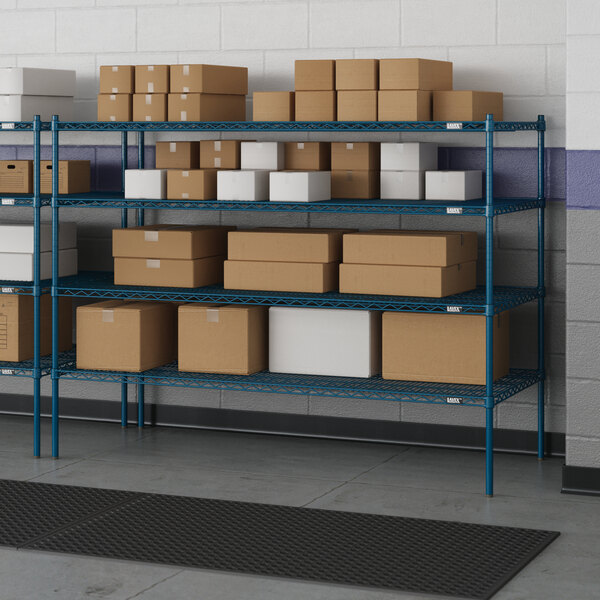Designed for use in moist or damp environments, this shelving unit is an excellent choice for organizing and maximizing storage space. Whether you're looking to streamline your warehouse operations or simply need additional storage in your industrial facility, this heavy-duty shelving kit is the perfect solution. Mix and match with Lavex Pro accessories (sold separately) to personalize your kit! Invest in the Lavex Pro blue epoxy heavy-duty 4-shelf kit and experience the durability and functionality it brings to your workspace.