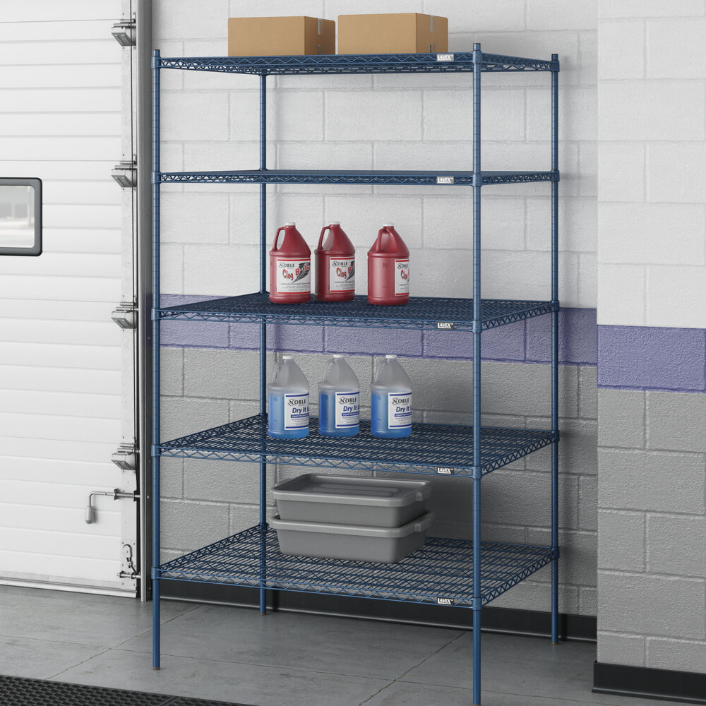 Designed for use in moist or damp environments, this shelving unit is an excellent choice for organizing and maximizing storage space. Whether you're looking to streamline your warehouse operations or simply need additional storage in your industrial facility, this heavy-duty shelving kit is the perfect solution. Mix and match with Lavex Pro accessories (sold separately) to personalize your kit! Invest in the Lavex Pro blue epoxy heavy-duty 5-shelf kit and experience the durability and functionality it brings to your workspace.