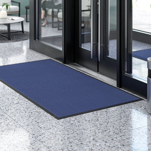 This mat is made with a blue polypropylene carpet material that resists fading, provides excellent moisture retention, and dries quickly. This mat's raised molded construction works to trap water and unsightly dirt below shoe levels, keeping it away from indoor floors.