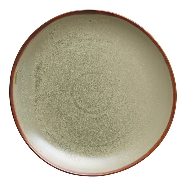 This Libbey Hedonite Sage 10" porcelain plate makes a great addition to any rustic tabletop setting. Thanks to the heat-reactive glazing process, this plate boasts an eye-catching, earthy sage green color and a thin terracotta edge that intermingle with each other and create unique designs. This process also ensures that every dish from the collection has its own individuality while following the same muted green color scheme. With a polished foot, you can also rely on this to not scratch other dishes or tabletops. Use this plate to serve large dinner entrees.