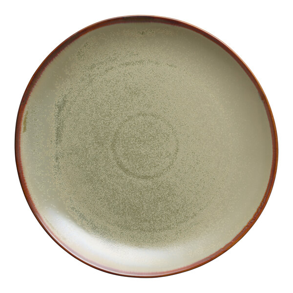 This Libbey Hedonite Sage 11 7/8" porcelain plate makes a great addition to any rustic tabletop setting. Thanks to the heat-reactive glazing process, this plate boasts an eye-catching, earthy sage green color and a thin terracotta edge that intermingle with each other and create unique designs. This process also ensures that every dish from the collection has its own individuality while following the same muted green color scheme. With a polished foot, you can also rely on this to not scratch other dishes or tabletops. Use this plate to serve large dinner entrees.