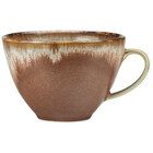 This Libbey Hedonite Sage 8 oz. porcelain cup makes a great addition to any rustic tabletop setting. Thanks to the heat-reactive glazing process, this cup boasts an eye-catching, earthy sage green color and a thin terracotta edge that intermingle with each other and create unique designs. This process also ensures that every dish from the collection has its own individuality while following the same muted green color scheme. With a polished foot, you can also rely on this to not scratch other dishes or tabletops. Use this cup to serve piping hot cups of coffee and tea while the ergonomic handle ensures that guests can safely handle the cup.